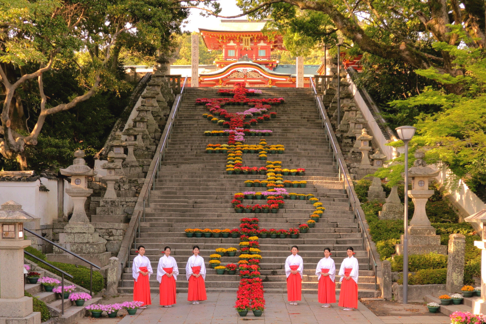 訪問した時期はちょうど「大石段 花回廊」イベントが行われていて、綺麗な花で飾られた階段からは良い香りが漂っていました。